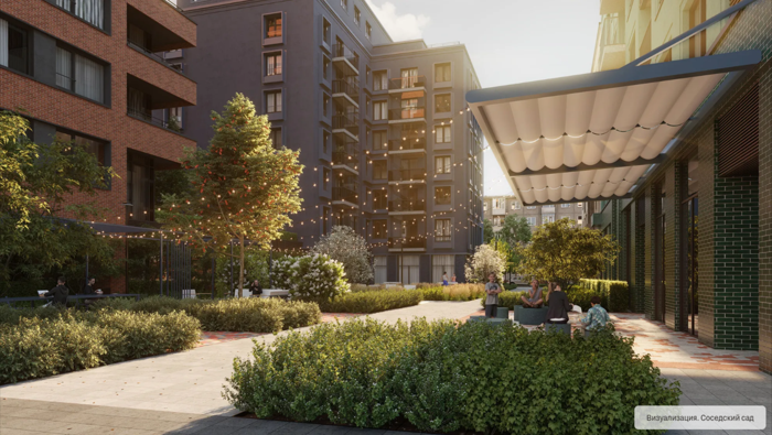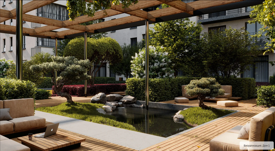 Местный бульвар с фонтаном проходит через всю застройку, есть детская зона, места для отдыха и арт-объекты. В проекте появятся места для более уединённого отдыха, например: купеческий дворик, оформление которого станет отсылкой к истории тюменского купечества